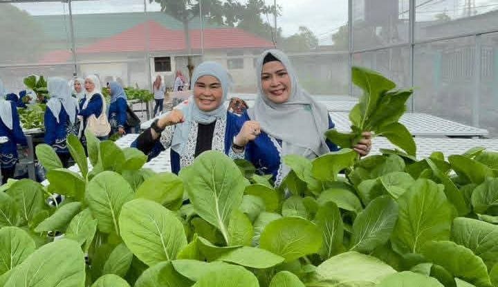 Pada kesempatan itu, Hj. Mustaidah bersama jajaran pengurus memanen sayuran sawi pakcoy yang dibudidayakan menggunakan sistem hidroponik di dalam rumah kaca (greenhouse). Tanaman tampak tumbuh subur, berwarna hijau segar, dan siap konsumsi, mencerminkan keberhasilan penerapan metode tanam modern yang relatif bersih dan efisien.