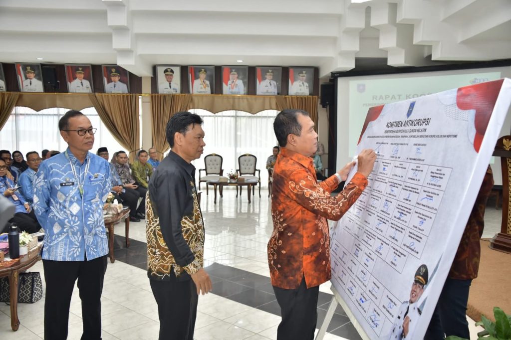 Penandatanganan komitmen tersebut dilakukan oleh Bupati HSS H. Syafrudin Noor bersama Wakil Bupati H. Suriani, Sekretaris Daerah, kepala perangkat daerah, hingga para camat. Langkah ini menjadi bagian dari upaya menjadikan HSS sebagai kabupaten percontohan antikorupsi.